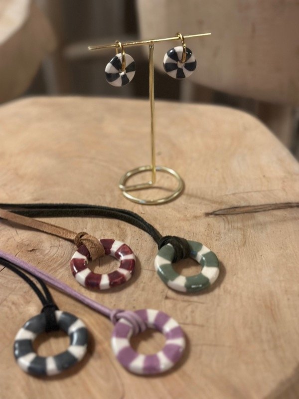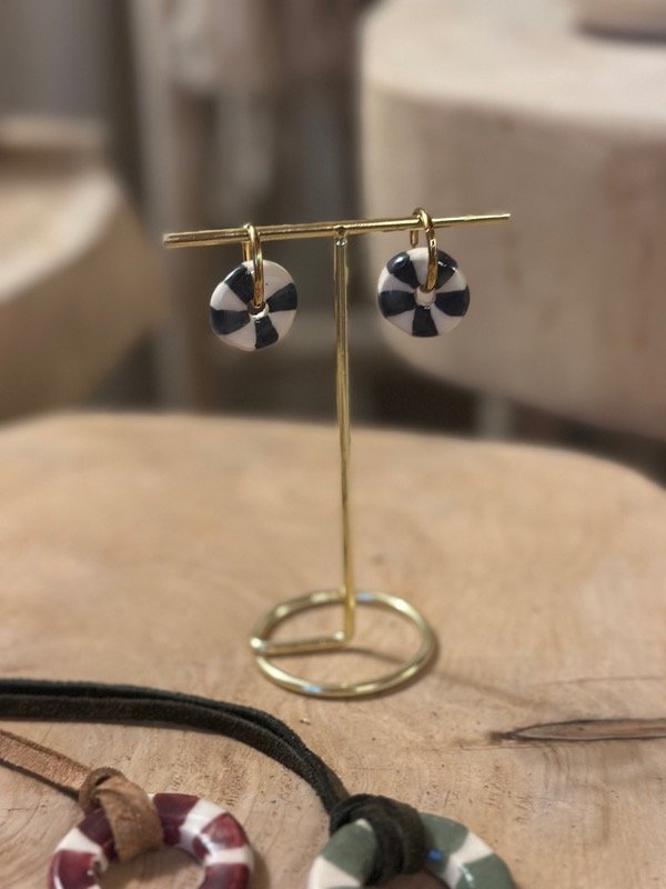 Aros con dije de cerámica con detalles en color gris oscuro.