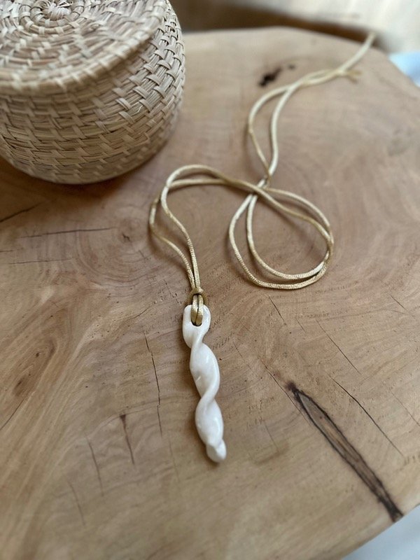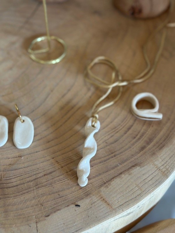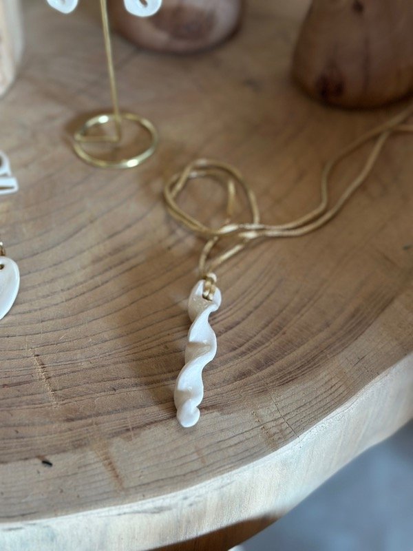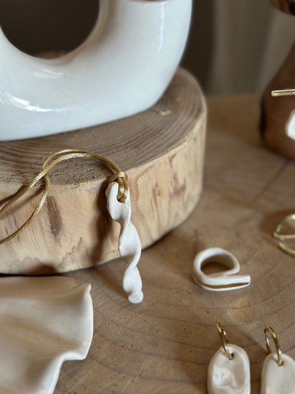 Collar con hilo de seda color dorado, dije del color natural de la cerámica.
